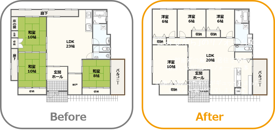 「住みながら」のリフォーム工事。一部屋ずつ解体し、居住空間を確保しながら2Fの住居部分を全面フルリフォームしました。